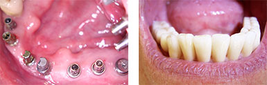 Auch einem gänzlich zahnlosen Kiefer können wir mit unserer modernen Implantologie ( Implantate mit Halteelementen, z.B. Steg im Unterkiefer) wieder zu einem natürlichen, ästhetischen Aussehen verhelfen.